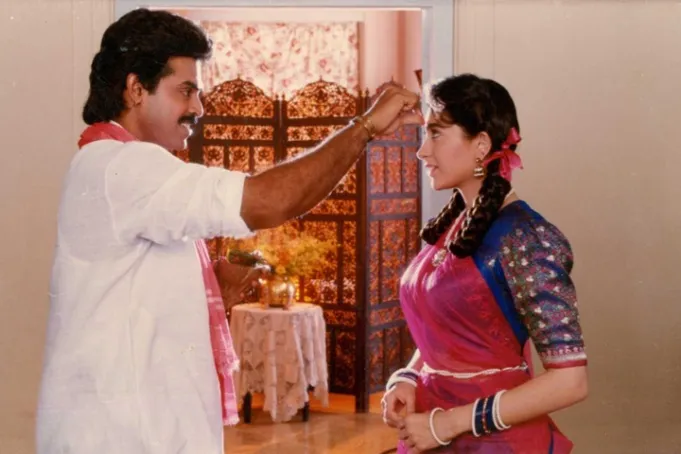 The remake of the 1991 Tamil film “Chinna Thambi” was a box-office blockbuster, with a collection of ₹6 crore. Apart from Venkatesh, the movie also featured Karisma Kapoor, Gulshan Grover and Suresh Oberoi.