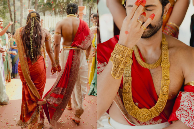 The Kodava motif on the back of Rashmika’s blouse was a nod to Rashmika’s Coorgi roots. The subtlety of it caught everyone’s eye. It was almost hidden but so powerful. I loved the Telugu hunting scene motif on Vijay’s red wedding angavastram. The same was embroidered on his ceremonial sword.