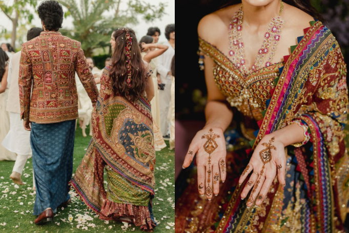 One moment that stands out is Rashmika’s mehendi’s outfit, where Karan Torani created an intricate Lakshmi artwork in a Tanjore style aesthetic with jewels tones. The temple arches on her shawl juxtaposed so beautifully with her modern jewel corset. It felt modern and sacred at the same time.