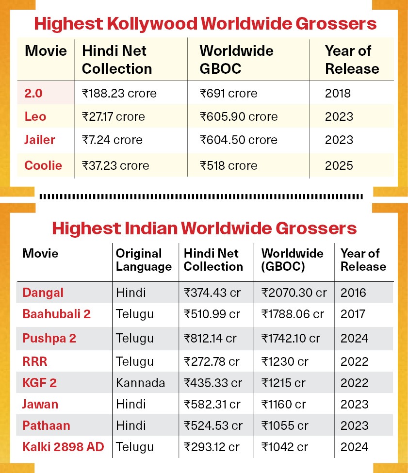 Prominent film trade analyst Komal Nahta voices that apart from Vijay, "There is no youthful hero who is a huge star in Kollywood." Explaining the importance of the Hindi market’s contribution to a film at the global box office, Bala mentions, “In the past, the movies which have grossed ₹1000 crore have at least made ₹400 crore from the Hindi market.” Recalling how 2018’s "2.0" gave Kollywood its highest grosser because of its performance in the Hindi market and pan-India casting, he adds, “The Akshay Kumar factor worked big-time in the northern part, but after that none of the Tamil films managed to recreate that magic.”
